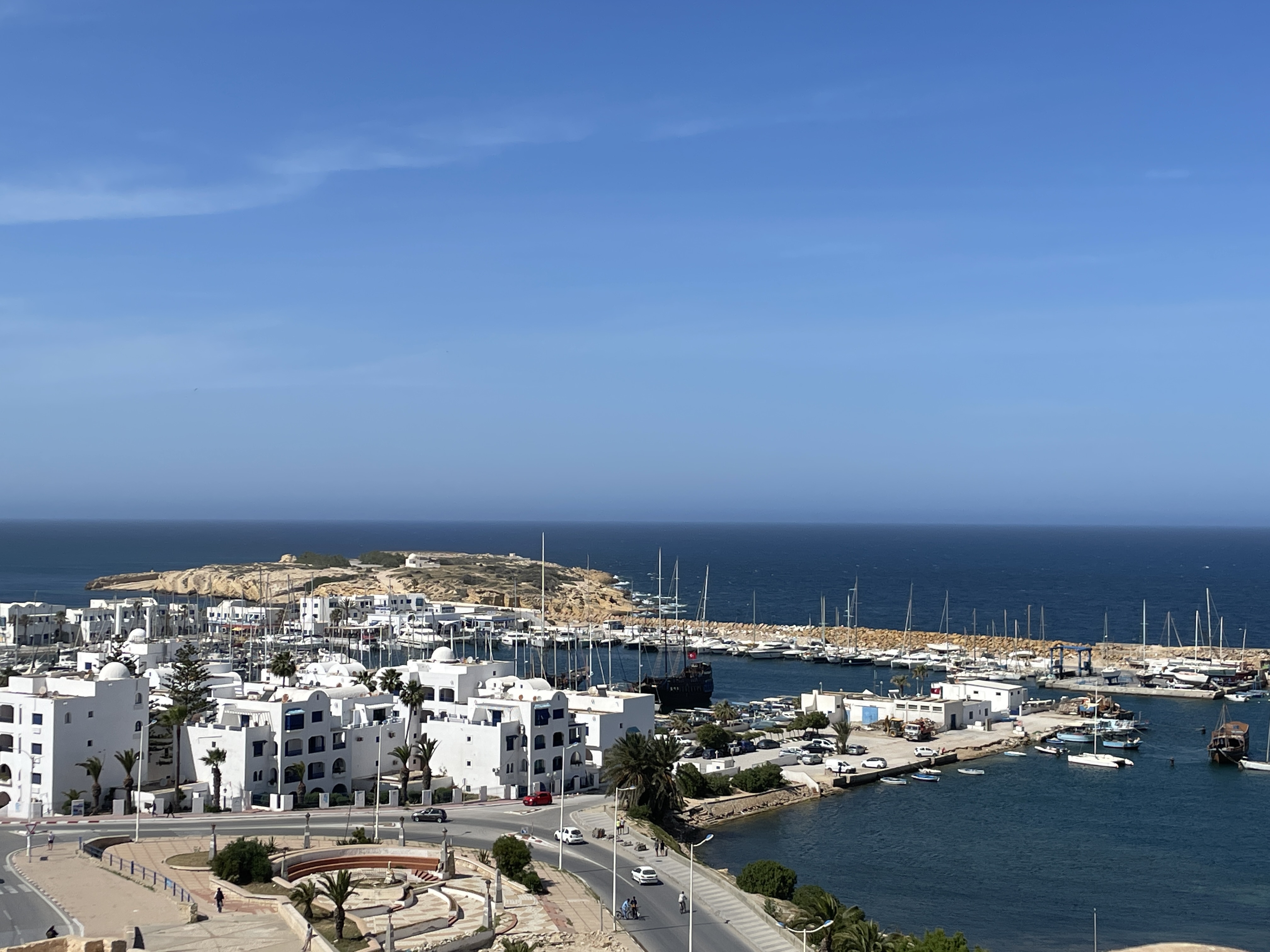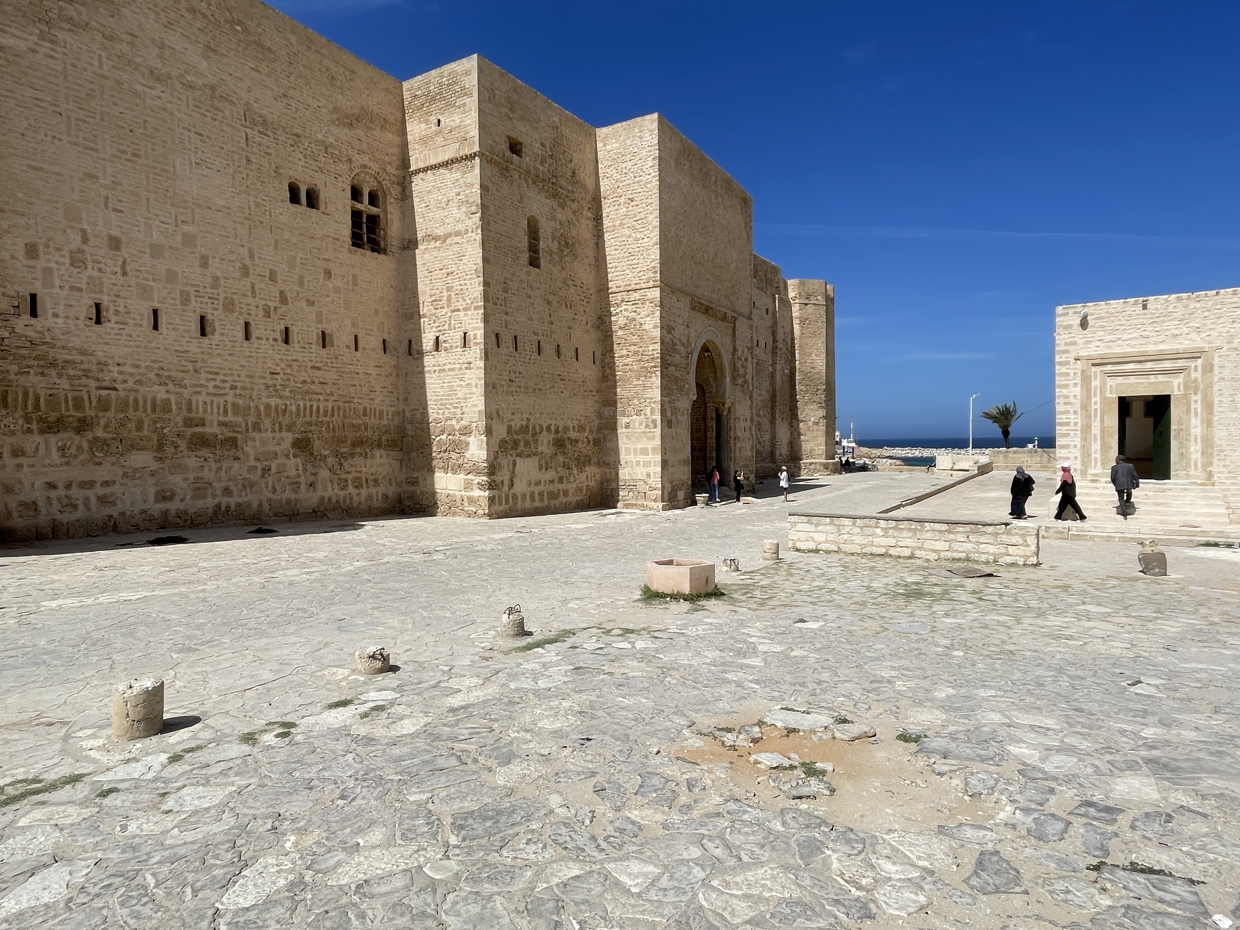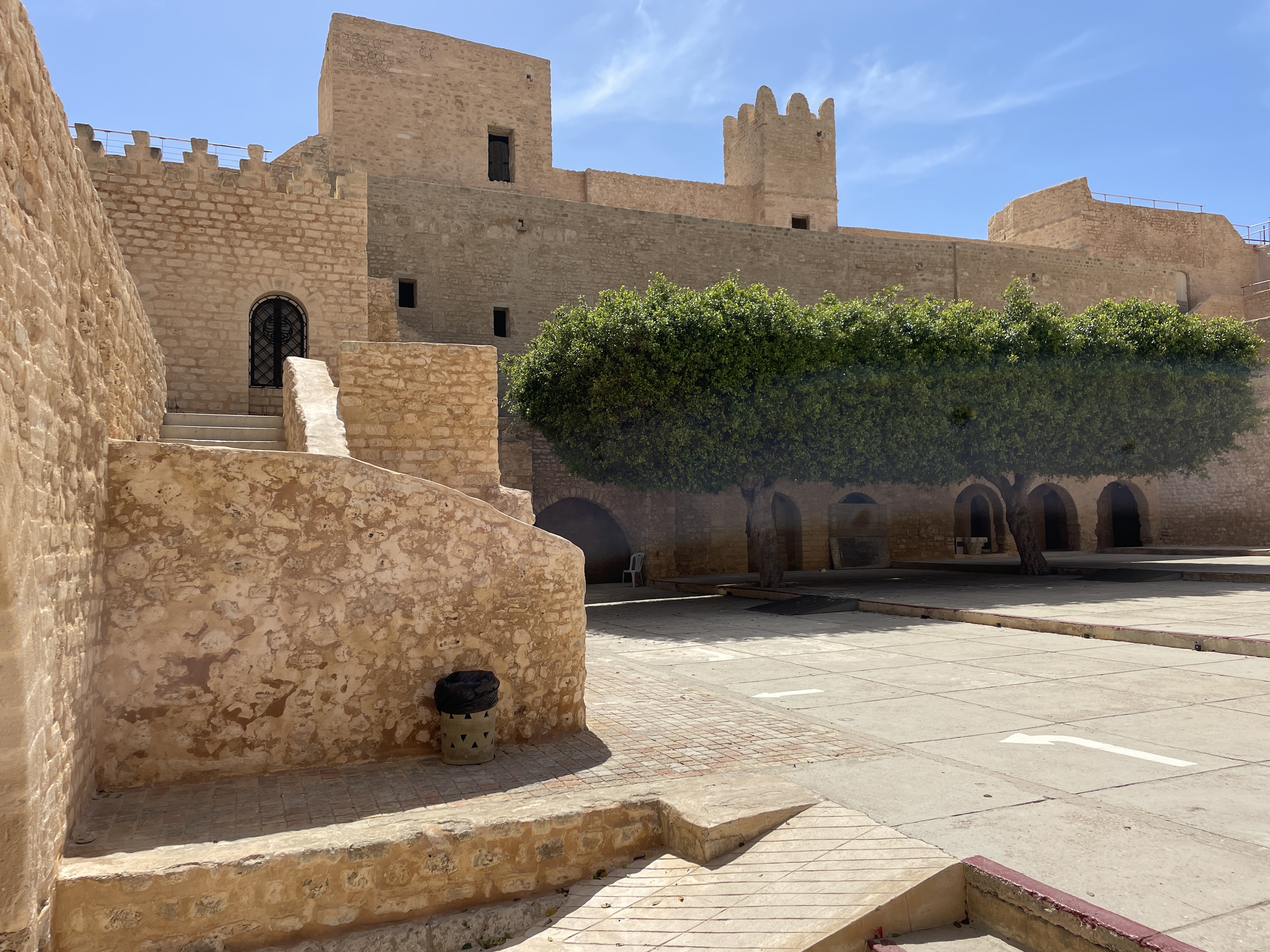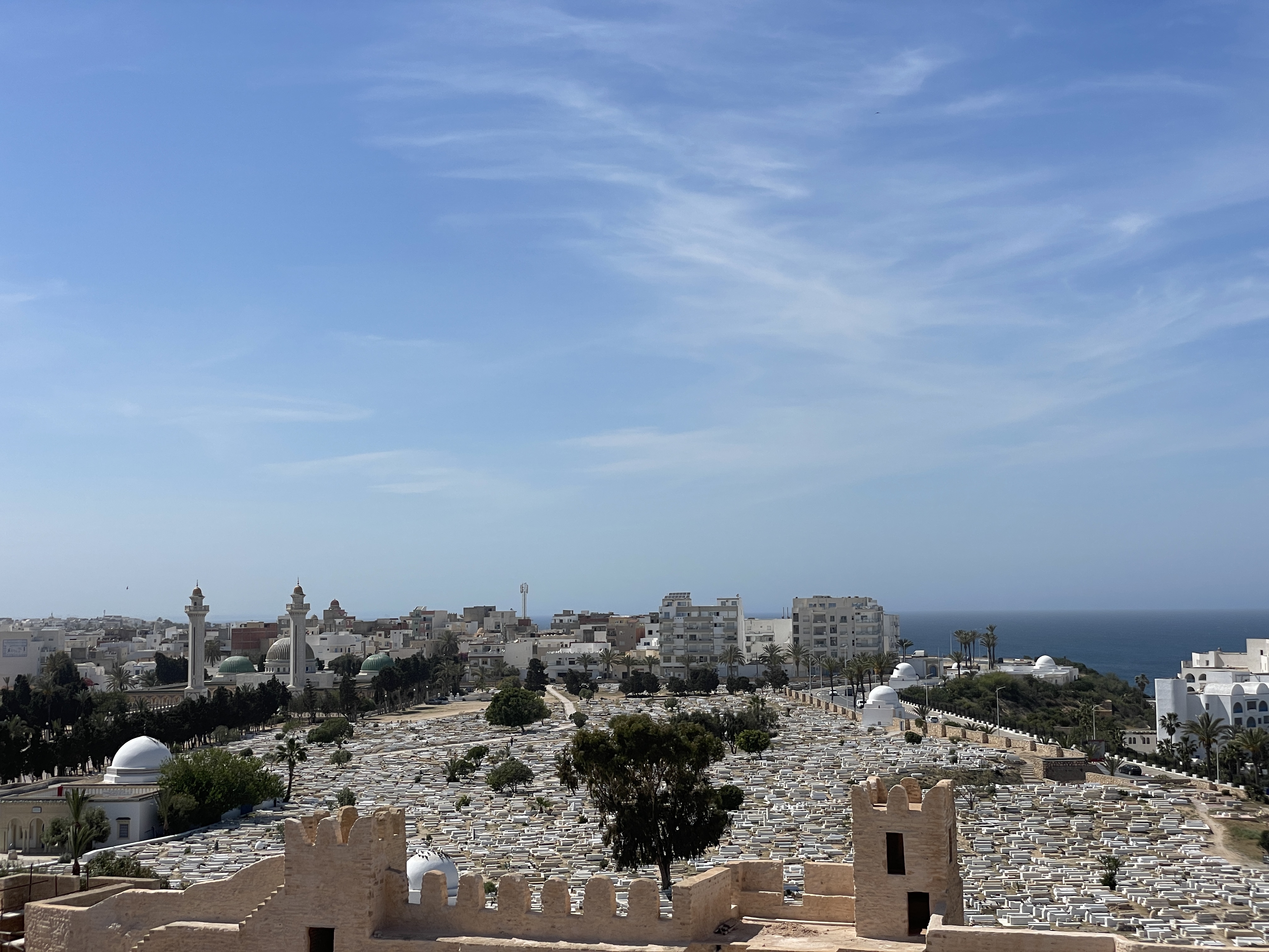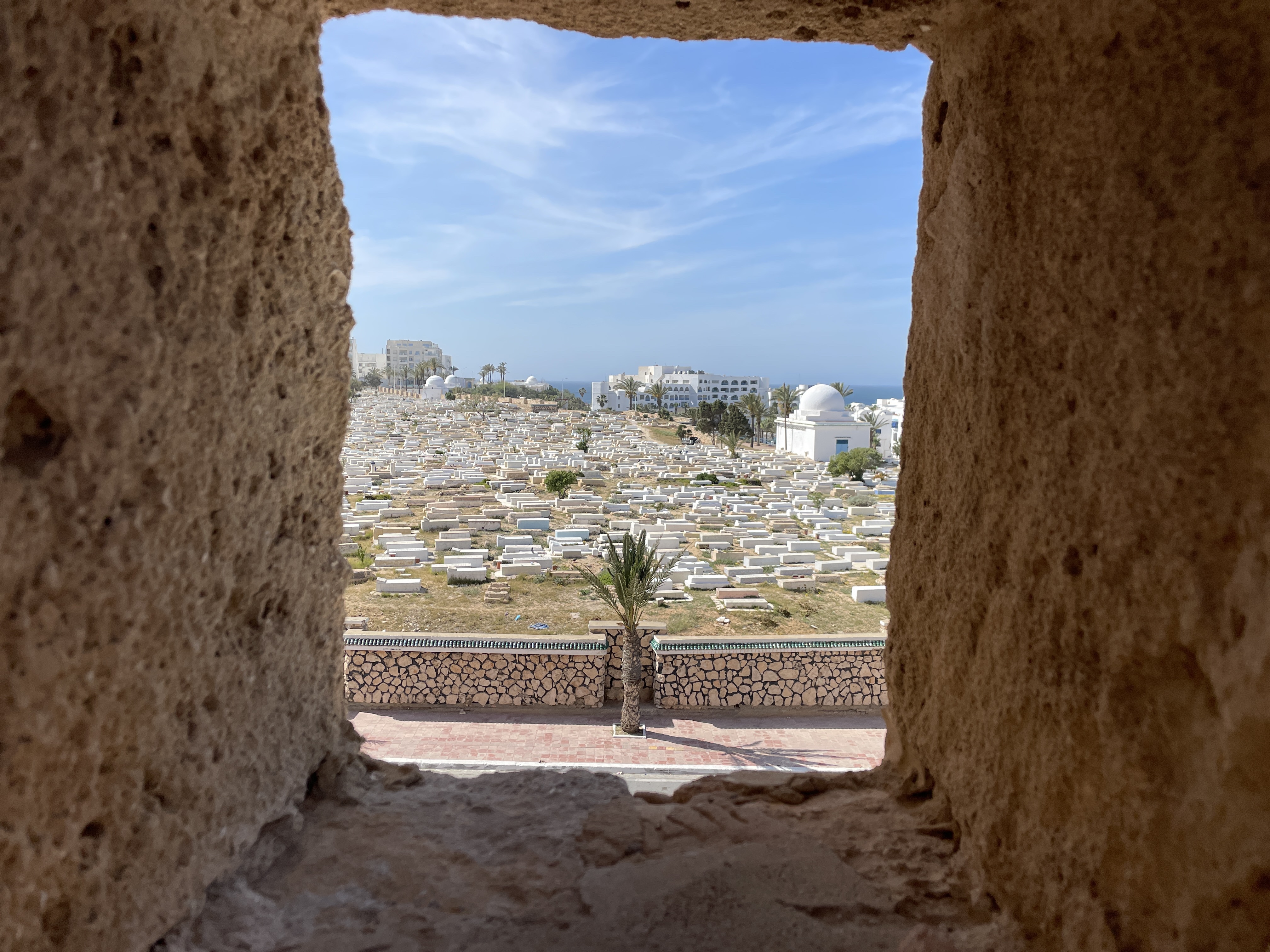 We arrived at the impressive fortress built in the late 8th century, one of several scattered across the top of Africa, this one was used to accommodate fighters and religious students and serve as early warning systems from Morocco to Egypt, for would-be invader’s. Although we had seen a couple of impressive Ribat’s in Morocco, this one was particularly awe-inspiring. It’s situated right next to a stunning beach, an expansive cemetery, and it looks like a big sandcastle! As you enter, you find yourself in an open area that leads off to upper levels with what we assume were religious dwellings and a prayer rooms. You can also walk along the fortress walls, which provide fantastic views all around. Finally, there’s a watchtower and at the top of 100 very narrow steps up to the crow’s nest.