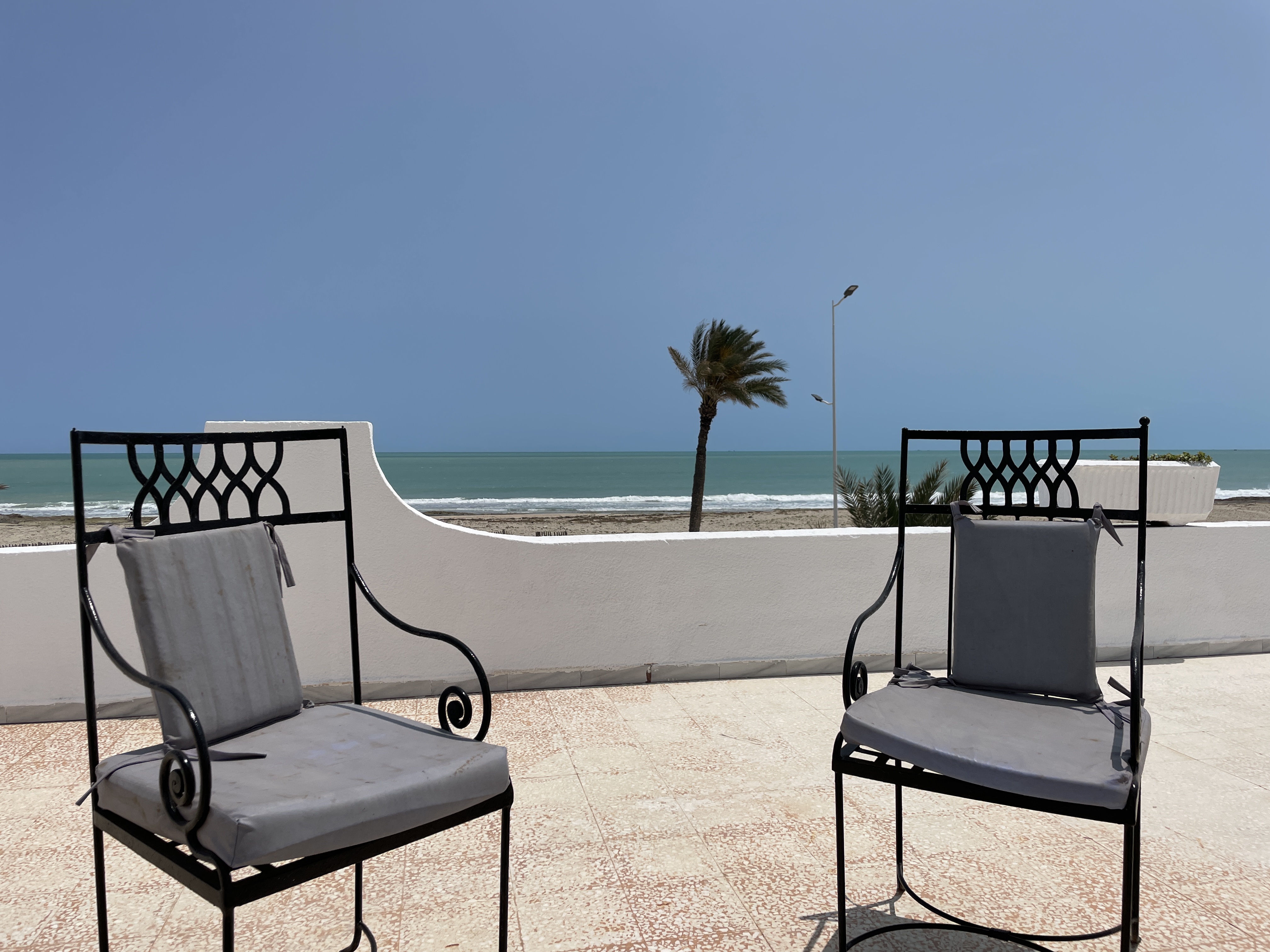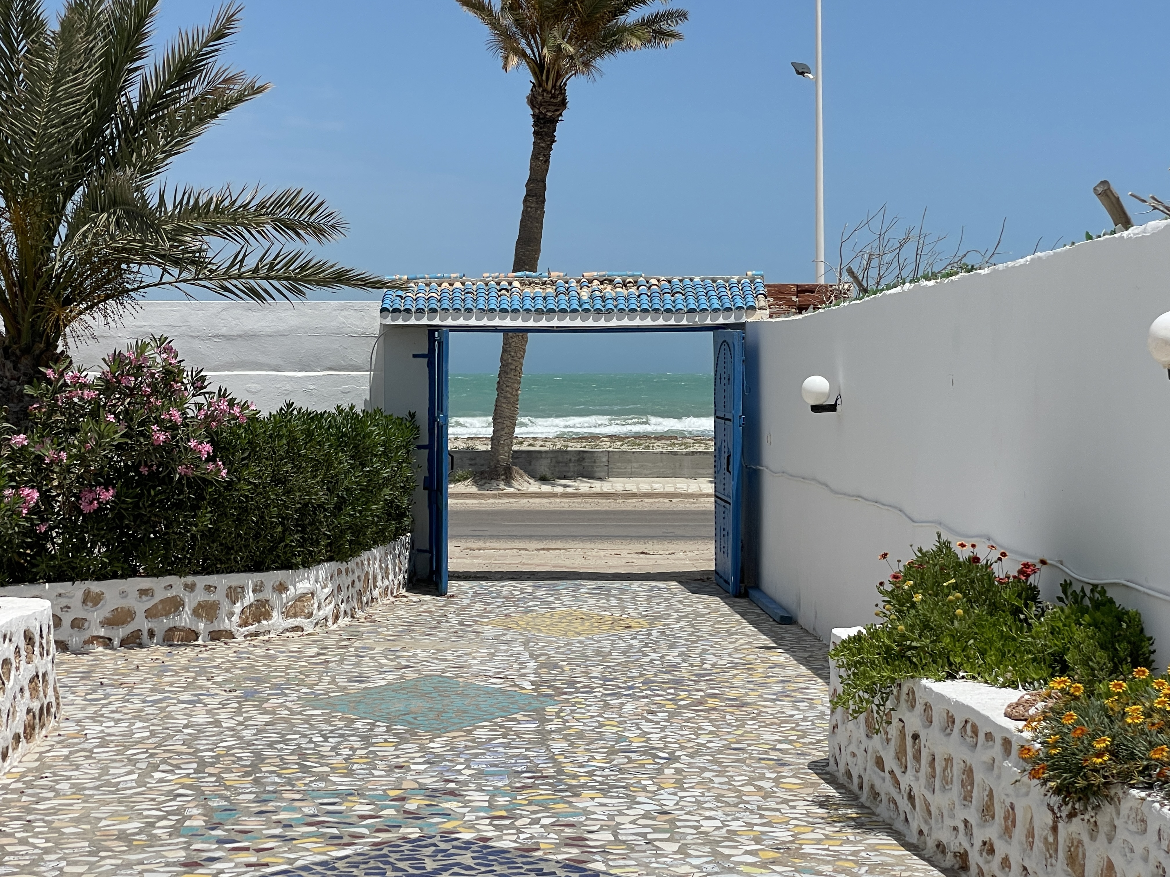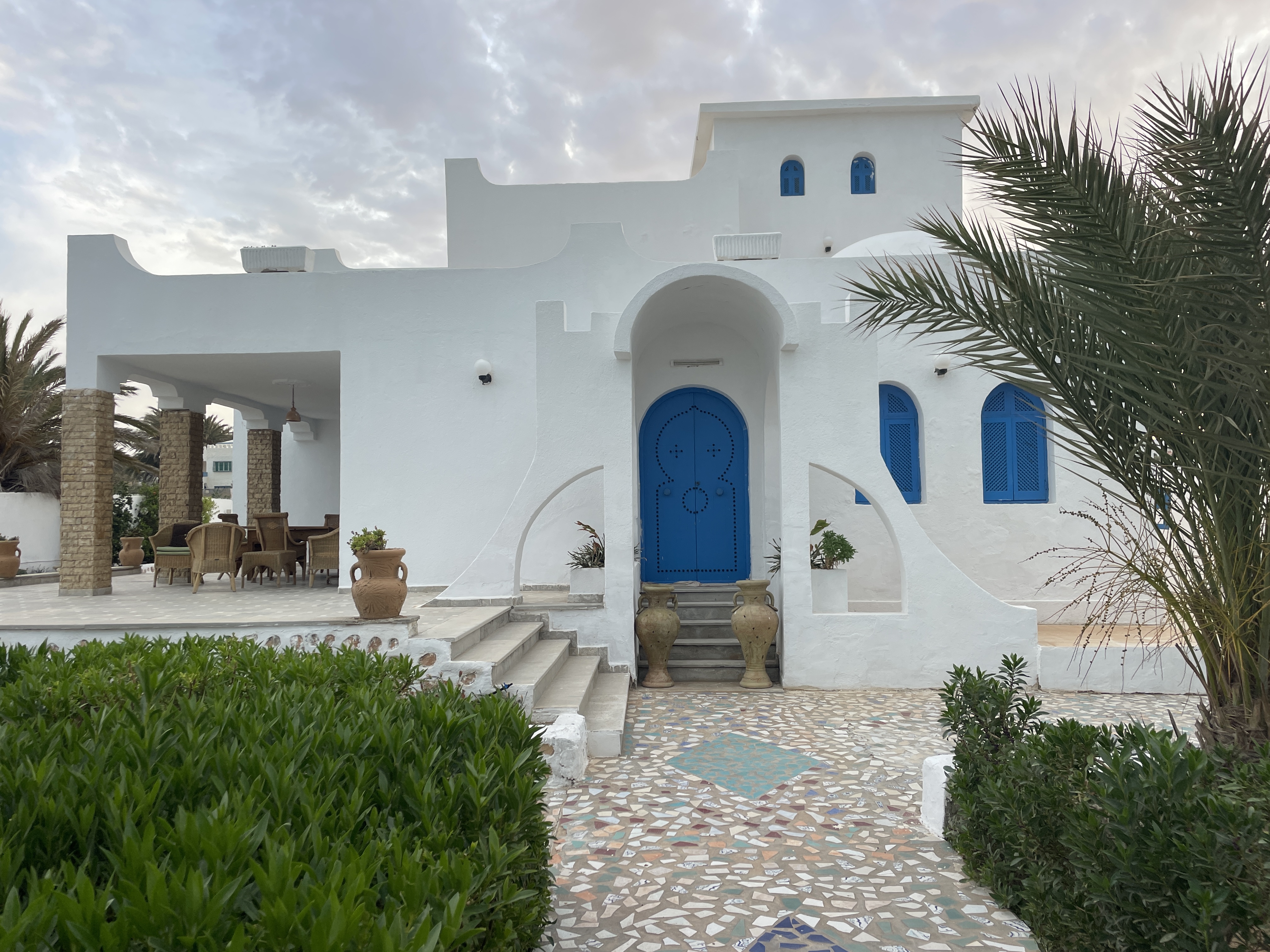 Zarzis is a smaller town than Mahdia and is located below the small island of Djebra, about 200 km from Tripoli. As I mentioned in an earlier post, we have been experiencing stormy weather with strong winds here in Tunisia and upon our arrival, we found the cleaning team at the villa re-cleaning due to the windows not being properly closed before the night before storm hit. After an early dinner at a restaurant, we returned to the villa to settle in. It is situated directly opposite the beach, offering spacious outdoor areas and a vibrant garden. I love the ornate doors around the property they’re very authentic. Additionally, all the doors and windows have an arched design, which may hold some significance. In Tunisia, the blue color of the doors and windows symbolizes peace and tranquility. The inside’s a bit eclectic though….it’s like moving through different periods in history!