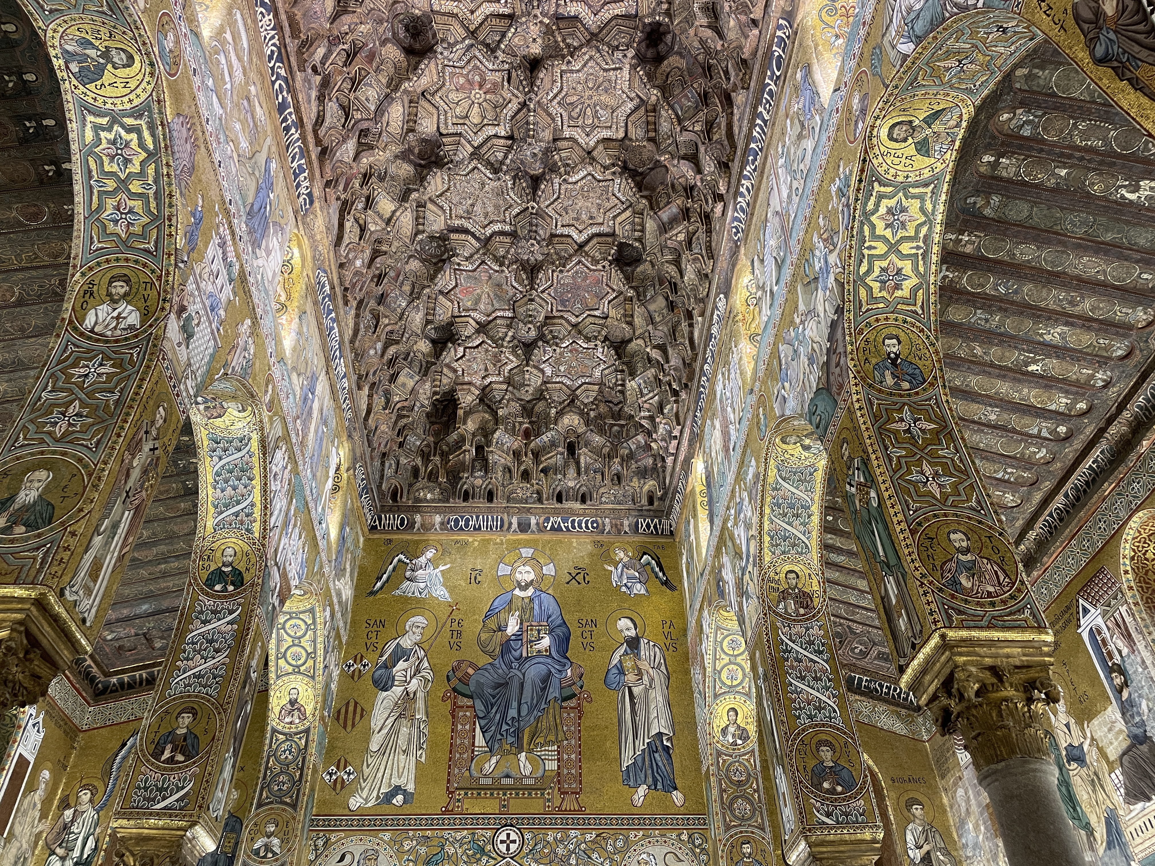 Next, we visited the Norman Palace, which looks especially impressive at night. The medieval facade harks back to the time when it served as the seat of the Kings of Sicily during Norman rule, and it continued to be a center of power for subsequent rulers. The Royal Apartments within the palace are ornate, but the real highlight for us was the Palatine Chapel, with its gold-covered mosaics. This masterpiece combines Byzantine art with Norman and Arab architectural influences, and the walls and ceilings are adorned with stunning gold mosaics. We had never seen anything quite like it before, and despite its relatively small size, we stood rooted in awe for over an hour, thoroughly absorbed in its beauty.