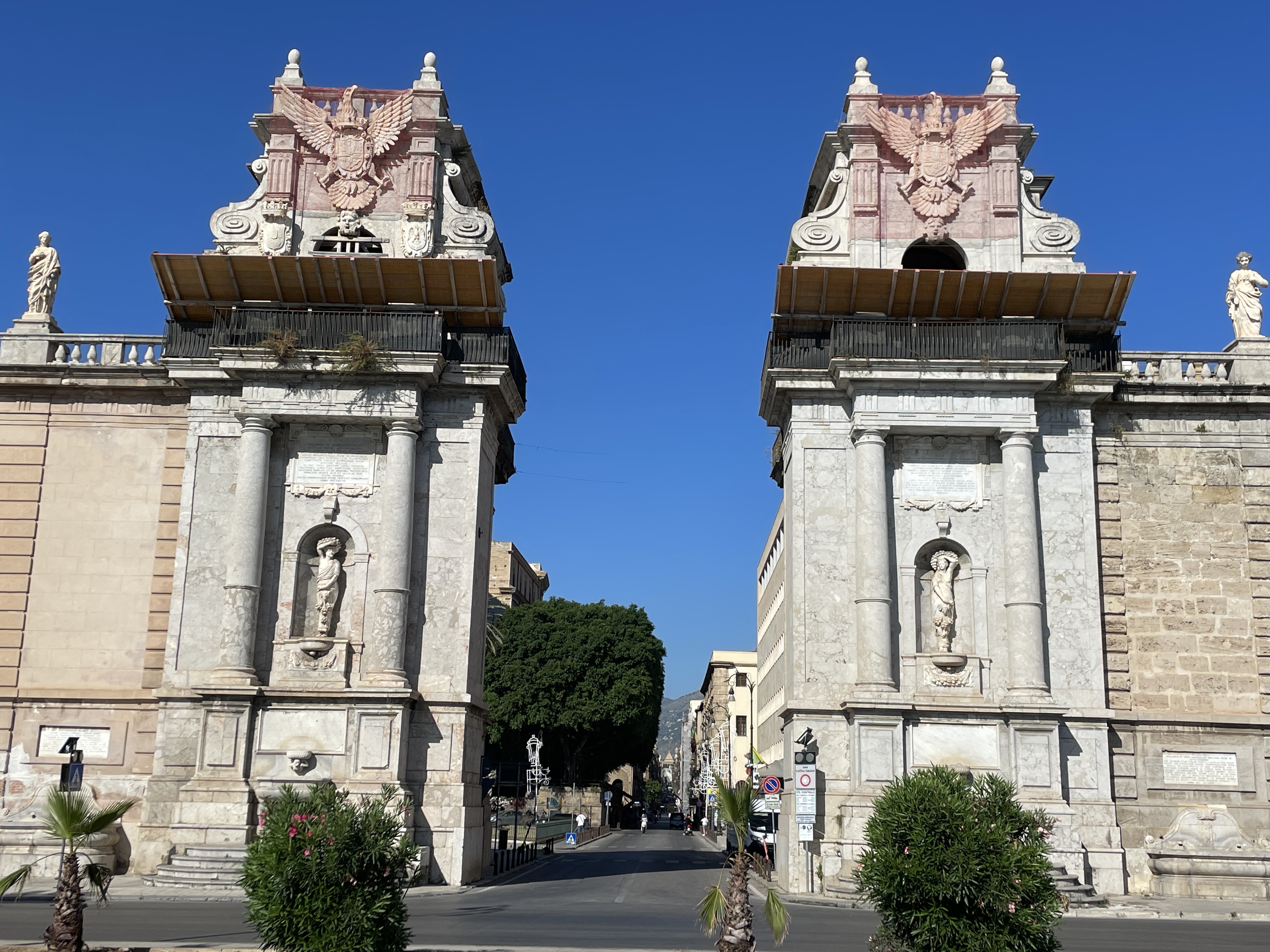 One of the unique spots we visited is the Quattro Canti (Four Corners), an octagonal square created where two of Palermo’s main roads, Via Vittorio and Via Maqueda, intersect. Each corner of the square is adorned with incredible statues, columns, or fountains, representing the primary districts of Palermo. It’s also a place where local musicians gather to entertain passersby.