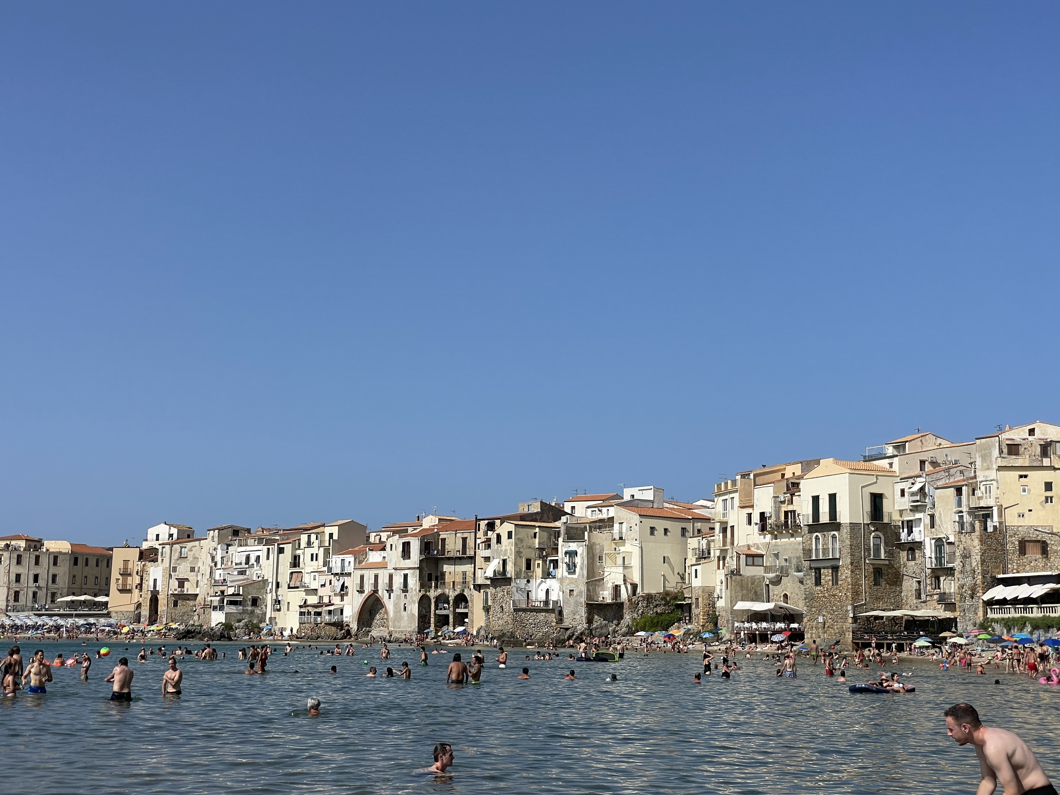 We spent a few hours at Mondello Beach, but we didn’t fancy the food options, so we decided to head back into the city for a late lunch and a leisurely stroll. We had originally planned a boat trip as our last hoorah, but it didn’t work out, so we decided to take a train to Cefalù, about an hour and fifteen minutes from Palermo. it’s a charming fishing town with medieval roots, evident as you descend from the train station to the beach. The town also boasts a remarkable 12th-century cathedral perched high up on a cliff, as if it’s been molded into the landscape. We spent a lovely afternoon at the beach before taking the fast train, “Intercity,” back to Palermo. The name brought back childhood memories of the Intercity 125 trains of the ’70s.