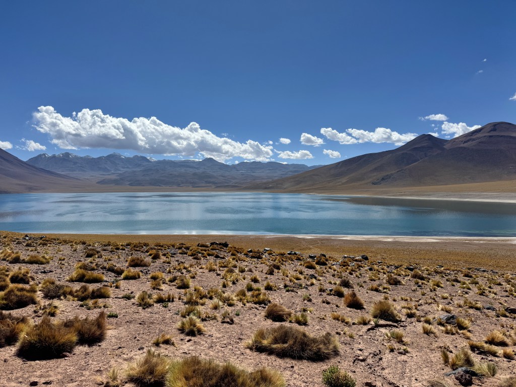 It was an early start for us, with our guide picking us up at 6:30am. The desert is cold in the morning. Our first stop, about an hour from San Pedro, was a small village where breakfast had been prepared. After a short stop, we headed off to our first national park and the Chaxa Lagoon to look at the flamingos. It felt a little random at first, but the salty conditions provide the perfect habitat for the shrimp that make up the flamingos’ staple diet. The flamingos here are white rather than pink, which apparently comes down to what the shrimp feed on.