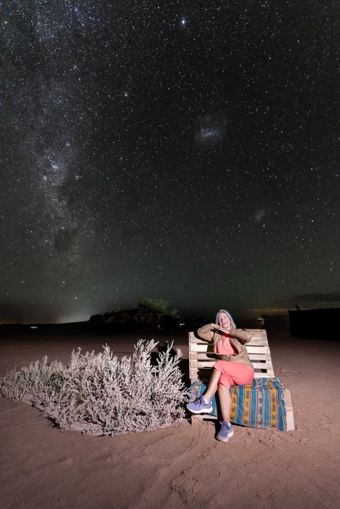 Our small suite was surprisingly comfortable. We even had air conditioning, which is rare in a place that runs entirely on renewable energy. It felt like we’d been travelling for most of the day, but I’d booked a night walk in the desert. Our guide picked us up along with a young friend of his who was practising her English, and their very well-behaved dog, Caramello. We walked through sand and dried-up riverbeds, learning about the area as we went. Eventually we stopped under the stars and sat around a small fire before heading back and collapsing into bed.