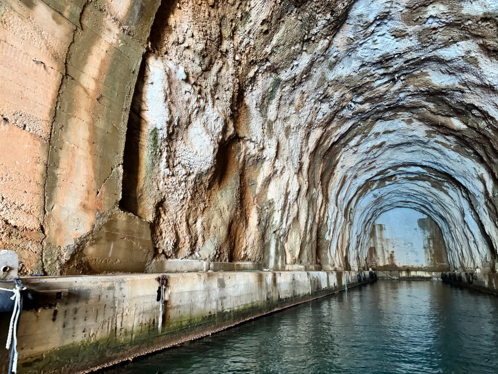 From there, we headed to the very top of the bay, about 20 kilometers from where we set off, to visit the fascinating submarine tunnels carved into the base of the mountain. Construction of these tunnels began in the 1950s, but a concerted effort by the Yugoslav navy in the 1970s saw the completion of three tunnels, with this being the largest. The tunnel was strategically used for surprise attacks, where small ships and submarines could stealthily approach the enemy. The tunnel itself spans 100 meters in length, but access beyond about 30 meters is barred by steel doors, as depicted in the picture below.